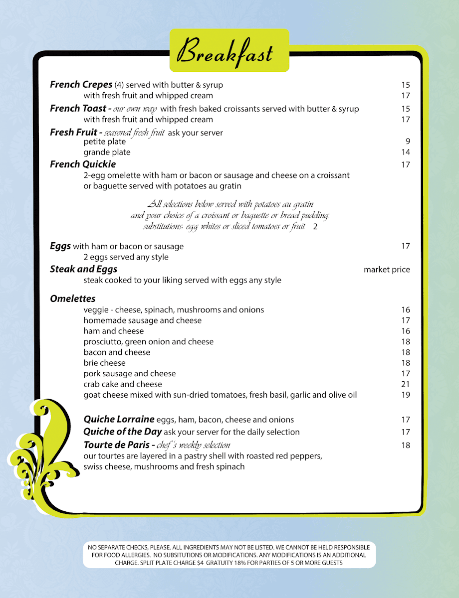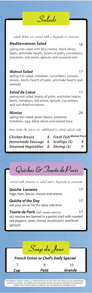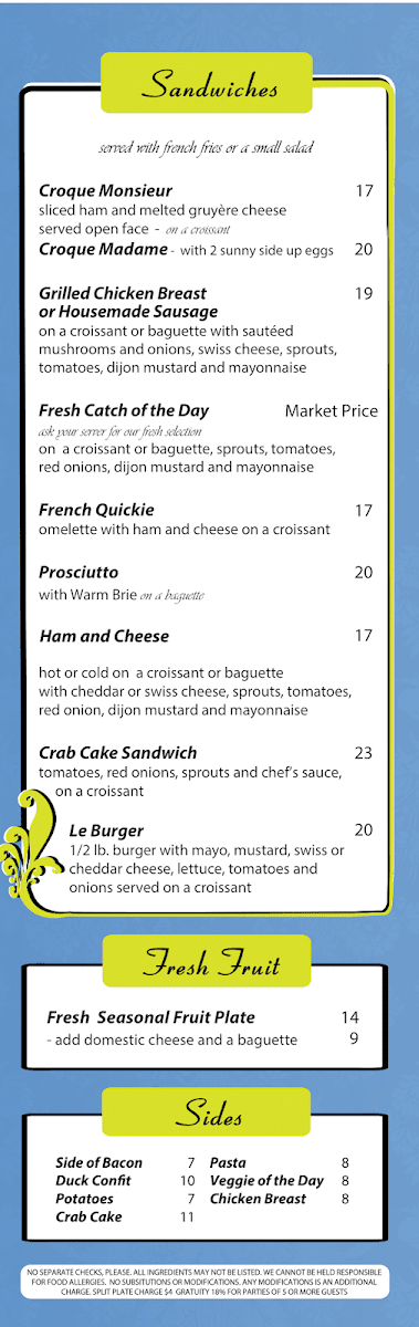 ask your server for our fresh selection; on a croissant or baguette, sprouts, tomatoes, red onions, dijon mustard and mayonnaise